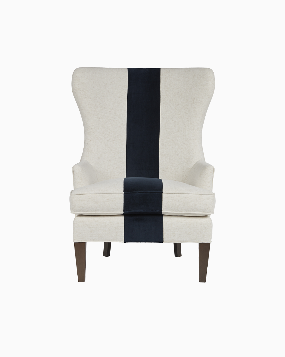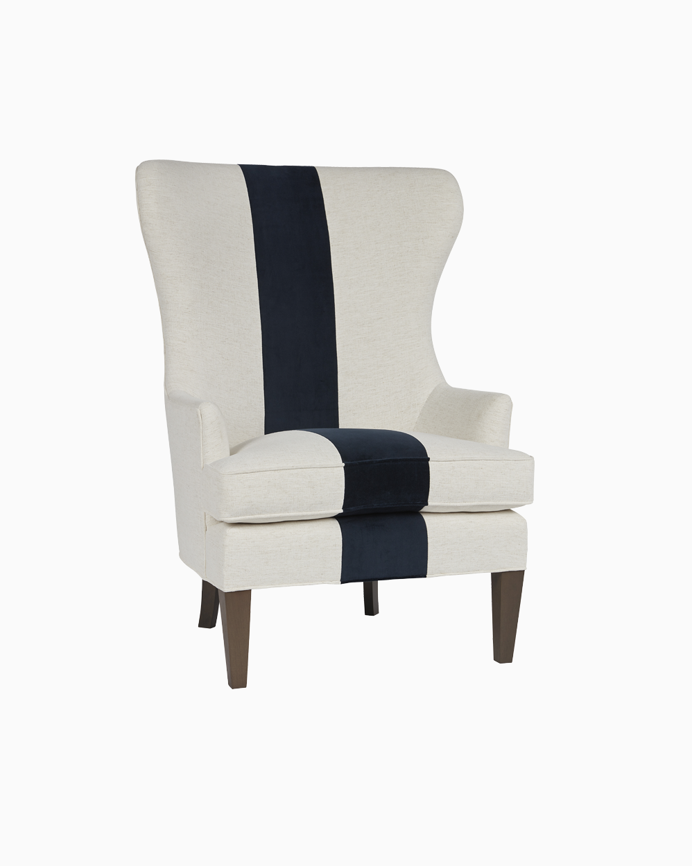 Description: A daring, vertical navy stripe defines the Surfside Wing Chair, a regal upholstery furnishing featuring an exaggerated back and tapered legs.